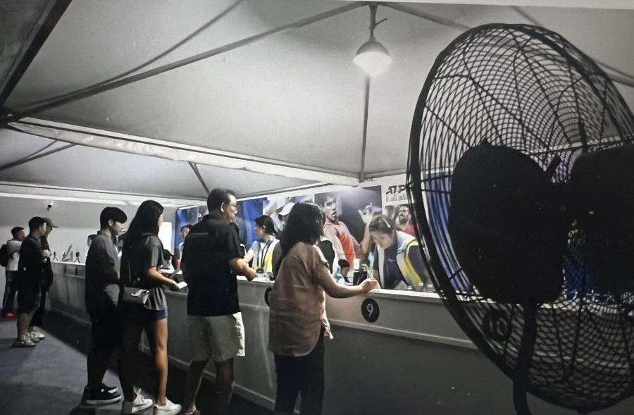 人流密集区的“风系加持” 同样细致高效。记者在现场看到,组委会在检票口、实名制服务点、中央场馆环廊等区域布设近 60 台降温设备,仅二楼环廊就整齐排列 18 台喷雾电风扇,吹出的风裹挟着细微水雾,让观赛的张女士直呼 “比树荫下凉快多了”。户外就餐区也实现了遮阳伞 100% 覆盖,露营椅旁的清凉风与远处球场的击球声交织成独特的赛事韵律。